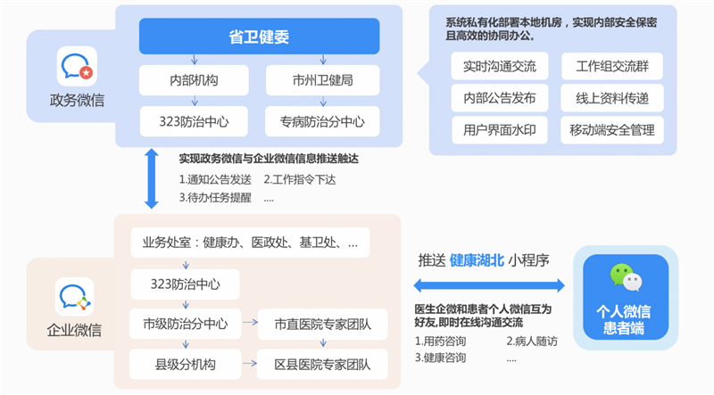 湖北省衛(wèi)生健康委員會(huì)323專病即時(shí)通訊平臺(tái)是公司基于政務(wù)微信、企業(yè)微信、個(gè)人微信和小程序打造的協(xié)同即時(shí)通訊生態(tài)模式,從而實(shí)現(xiàn)各級(jí)部門、各類用戶、各種場(chǎng)景的互聯(lián)互通。為湖北衛(wèi)健委323專病工作,提供連接、認(rèn)證、觸達(dá)和擴(kuò)展的即時(shí)通訊支撐能力。