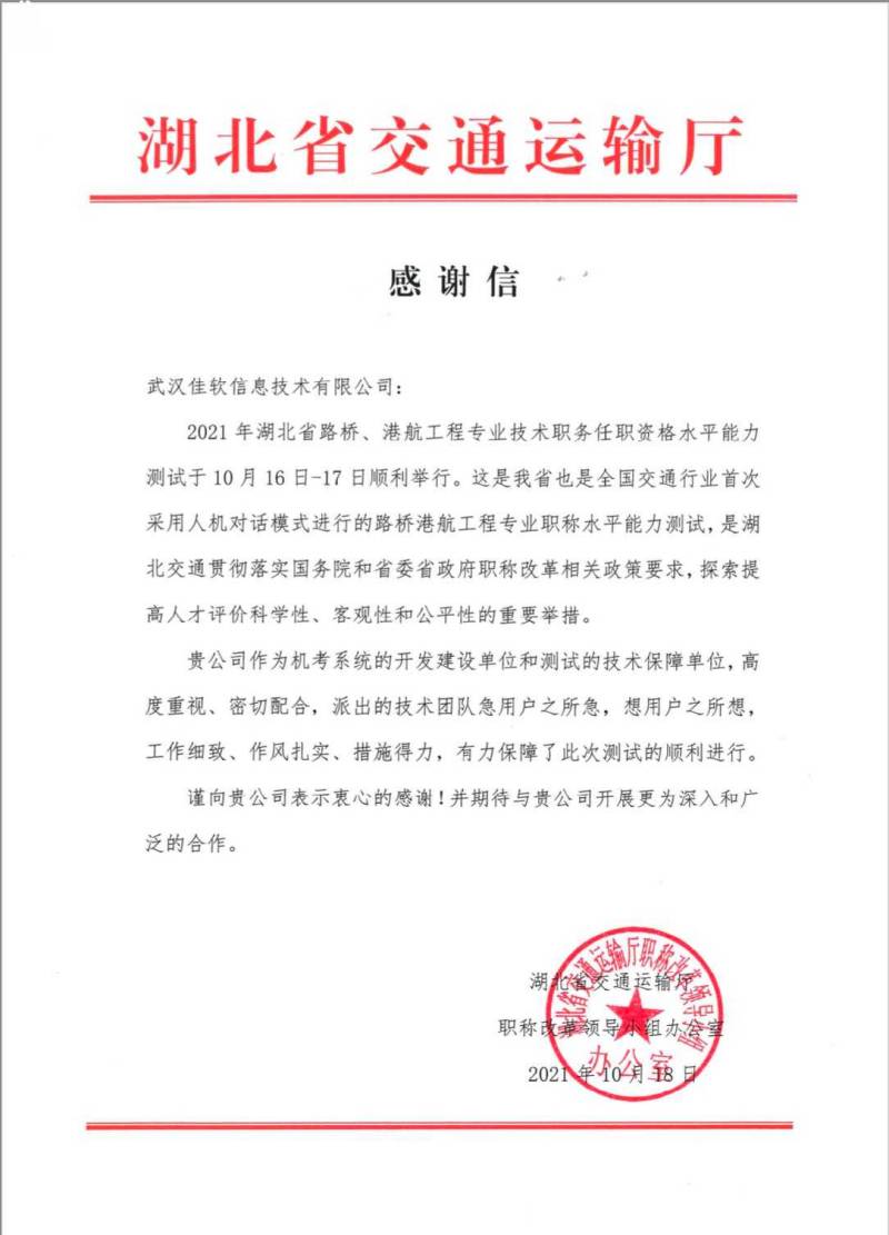 考試結(jié)束后,湖北省交通運(yùn)輸廳職稱改革領(lǐng)導(dǎo)小組辦公室對項(xiàng)目小組積極主動、盡職盡責(zé)的工作態(tài)度和過硬的技術(shù)實(shí)力給予了高度贊揚(yáng)。這不僅是對項(xiàng)目小組工作的肯定,也是對公司專業(yè)技術(shù)和服務(wù)能力的認(rèn)可。未來,公司將一如既往秉承以客戶服務(wù)為中心,以更加優(yōu)秀的產(chǎn)品和服務(wù)創(chuàng)造更加優(yōu)異的成績。
