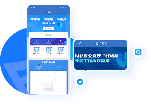 2021年9月,湖北省公安機關(guān)堅持下先手棋、打主動仗,啟動“找窟窿、堵窟窿、防透風”專項行動。警輔通平臺提供“找堵防”專項行動的隱患上報、數(shù)據(jù)核查、任務接收與反饋功能。實現(xiàn)隱患大排查、大起底、大整治的高效開展。