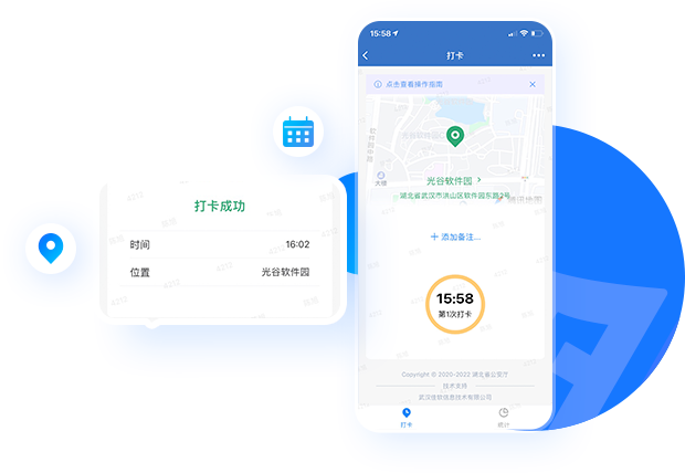 支持上下班打卡、外勤打卡等場景,進行打卡操作后,應用會自動記錄當前用戶的打卡時間、地點以及次數(shù)等信息。