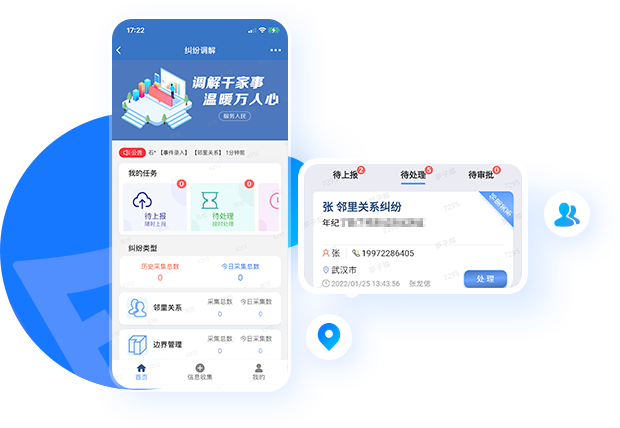 基于輔警通平臺的綜合調(diào)解服務應用,在線收集糾紛信息,定位糾紛地點,上報糾紛事件,派發(fā)責任人處理,線下調(diào)解線上匯報、單位審核歸檔,快速的為用戶解決民事糾紛問題,實現(xiàn)智能一體化辦理。